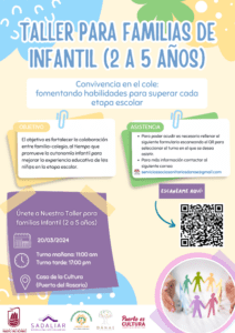 Esta charla-taller está organizada por la UTE Dánae-Sadaliar dentro del Programa de Prevención Comunitaria del Ayuntamiento del Puerto del Rosario y tendrá una metodología participativa. Está destinada a familias con hijos e hijas de edades comprendidas entre los 2 y los 5 años, y se llevará a cabo este miércoles, 20 de marzo de 2024, en la Casa de la Cultura de Puerto del Rosario con dos horarios a elegir, las 11:00 y las 17:00 horas.