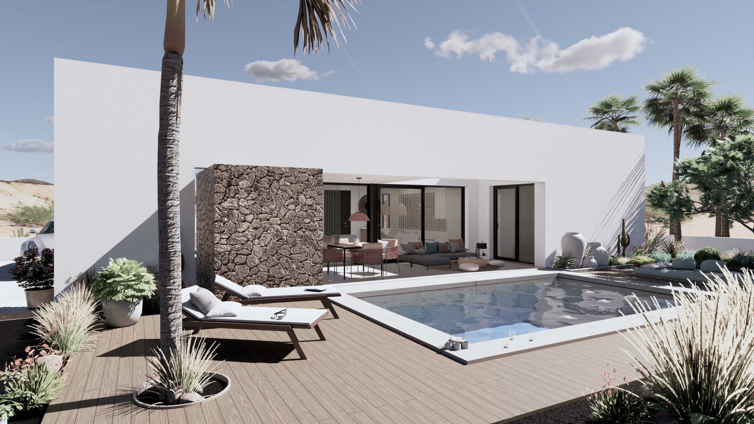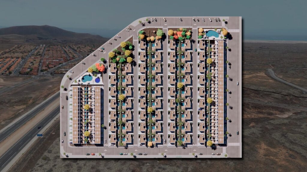 Este proyecto surge en respuesta a la creciente demanda de viviendas en Fuerteventura y contempla la construcción de 120 unidades de dos tipologías diferentes. La primera tipología consiste en villas independientes de una sola planta, con 80 m² construidos en parcelas de 238 m². La segunda tipología incluye chalets adosados de dos plantas, con 60 m² de construcción y parcelas de hasta 163 m².