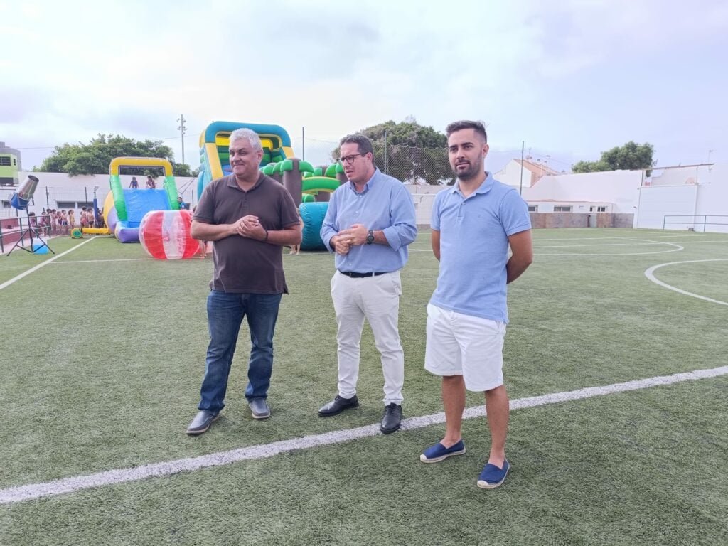 Este miércoles, el alcalde de Puerto del Rosario, David de Vera, el concejal de Deportes, Juan Jiménez, y el gerente del Grupo Tafor Canarias S.L., Adasat Alonso, realizaron una visita a los participantes en las Escuelas Deportivas de Verano gratuitas de Puerto del Rosario, que estos días superan su ecuador.