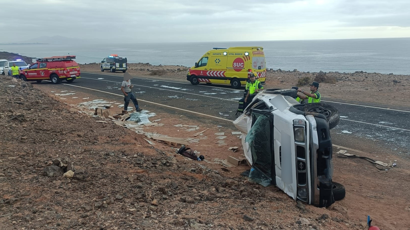 El siniestro, que implicó el vuelco de un vehículo, movilizó de inmediato a un amplio dispositivo de emergencias. Efectivos de Bomberos de La Oliva trabajaron en la extracción de uno de los ocupantes, que había quedado atrapado en el interior del coche siniestrado.