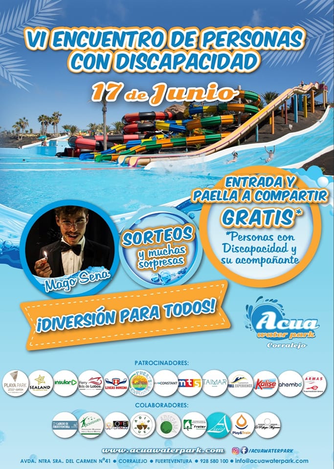 La jornada tendrá lugar el sábado, 17 de junio, en Acua Water Park, en Corralejo Diversión para todos. Así se presenta, un año más, el VI Encuentro de Personas con Discapacidad de Canarias, que se celebrará el sábado 17 de junio en el parque acuático Acua Water Park, situado en Corralejo (Fuerteventura).