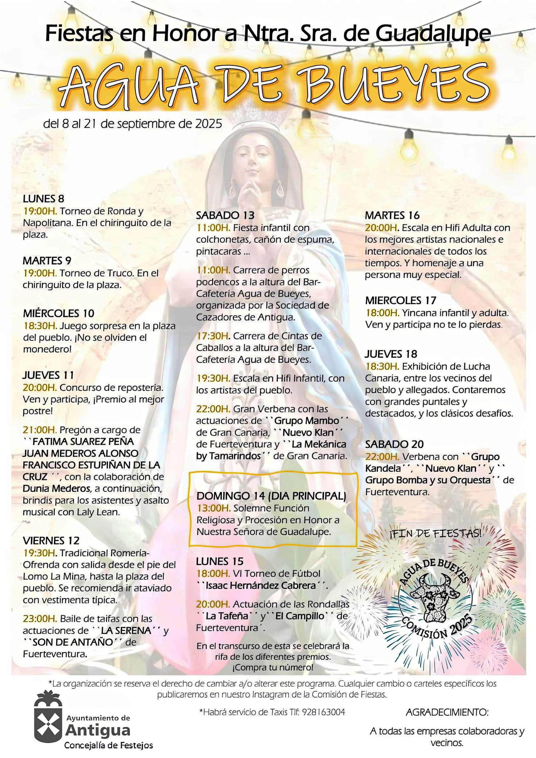 Agua de Bueyes se viste de gala para celebrar a su patrona, la Virgen de Guadalupe. Durante dos semanas, del 8 al 21 de septiembre, el pequeño pueblo de Antigua será escenario de encuentros, risas, devoción y noches de verbena que, como cada año, reúnen a generaciones enteras.