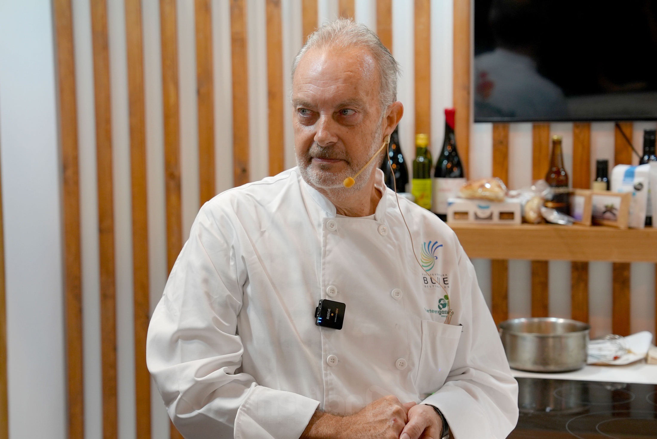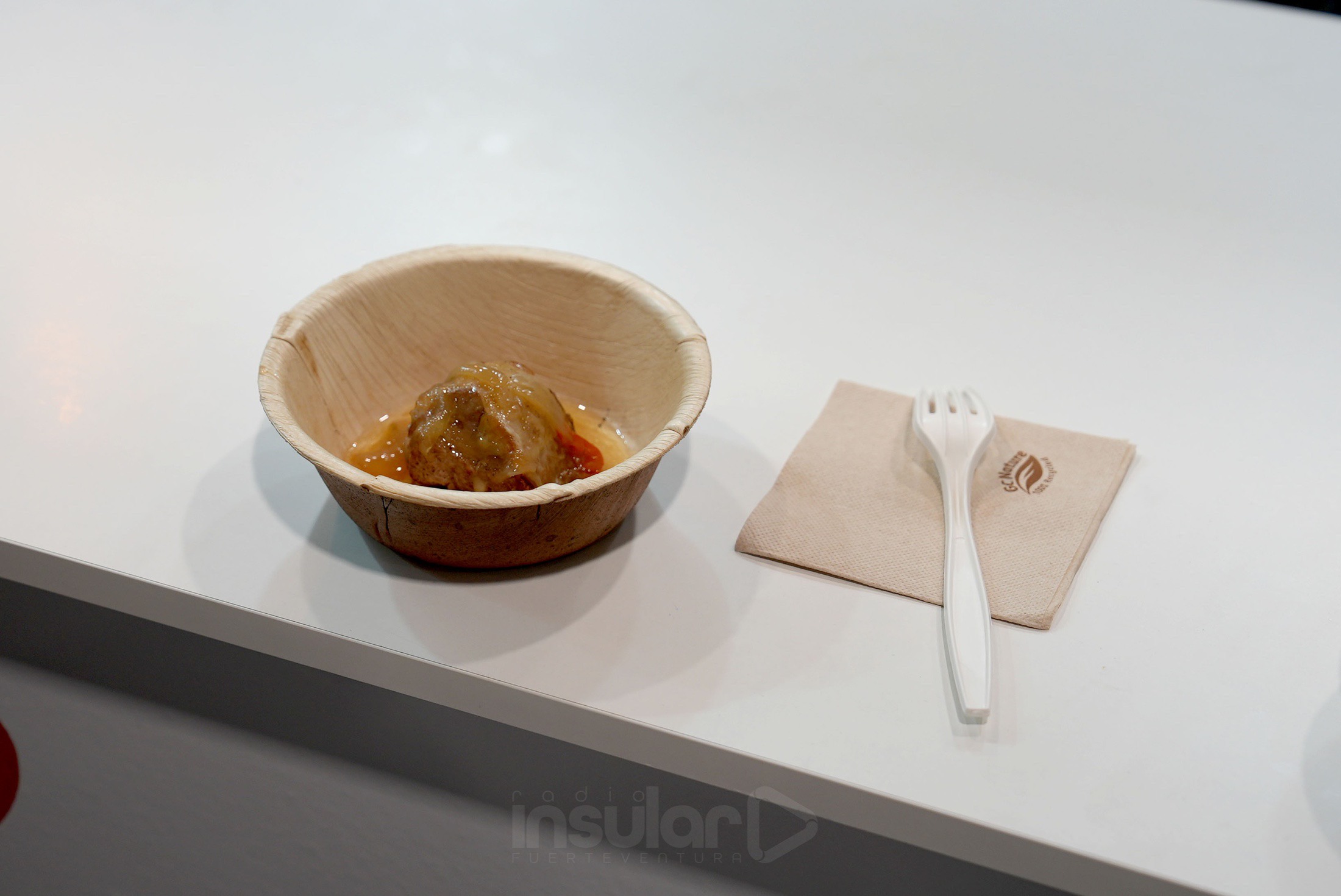 La propuesta culinaria corrió a cargo del chef Juan Carlos Campos, del restaurante Mar Dorado, ubicado en Caleta de Fuste, quien presentó un menú compuesto por tres elaboraciones que combinan técnica, memoria y producto del territorio. “Venimos con tres platos: un entrante, un plato principal y un postre. El entrante es una tosta de pan de matalauva con anchoa, mus de queso majorero ahumado y una confitura de tomate. Como plato principal, un muslo de cabrito de baifo en escabeche blanco, cocinado a baja temperatura durante cinco horas”, explicó el cocinero durante la exhibición.