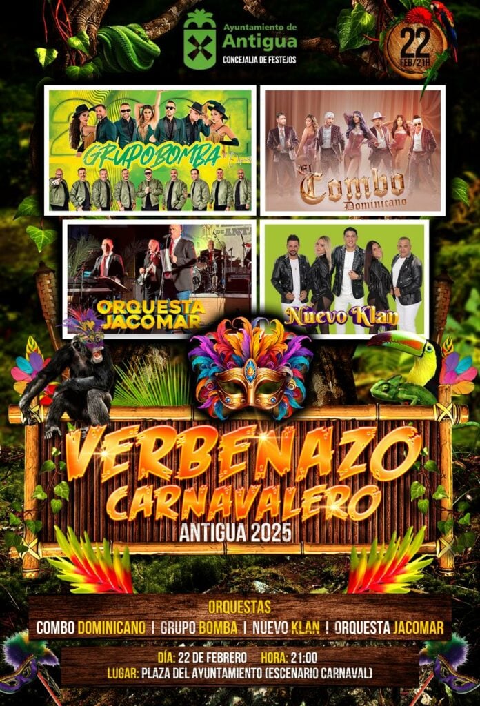 El Coso Carnavalero recorre las calles de Antigua desde las 18:00 horas, llegando sin prisa al recinto ferial donde un Verbenazo Salvaje dará comienzo a las 21:00 horas y hasta 05:00 de la madrugada. Sobre el escenario, el Combo Dominicano, embajador de los carnavales latinos, que estará acompañado por el Grupo Bomba, y las orquestas Jacomar y Nuevo Clan.