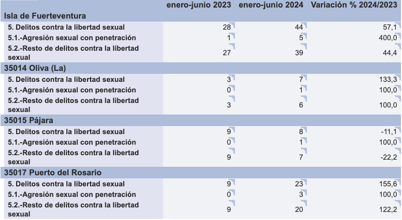 En La Oliva, los delitos totales aumentaron de 3 a 7, un crecimiento del 133,3%. Aunque en 2023 no se registraron agresiones sexuales con penetración, en 2024 hubo un caso. El resto de delitos subieron de 3 a 6, lo que refuerza la tendencia de crecimiento general.