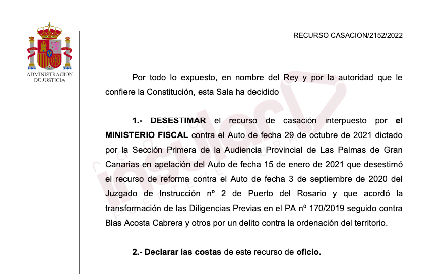 Esta decisión del Tribunal Supremo refuerza la posición del actual vicepresidente del Cabildo de Fuerteventura y secretario general del PSOE en la isla, Blas Acosta, quien, con este fallo, queda libre de cualquier procedimiento judicial en su contra, a excepción del recurso interpuesto por la Fiscalía en el Caso SUP-5, en el que Acosta y el exalcalde de Pájara, Rafael Perdomo, fueron absueltos tras nueve años de proceso.