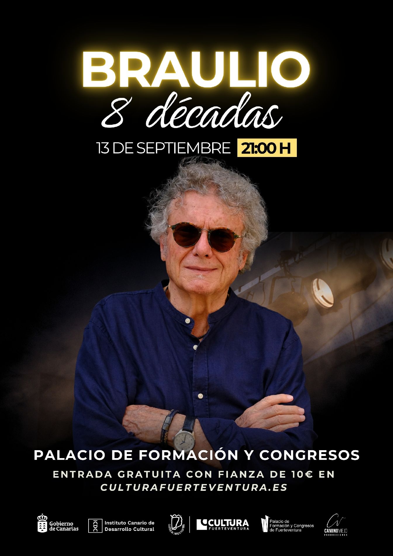 El próximo 13 de septiembre, a las 21:00 horas, el Palacio de Formación y Congresos de Fuerteventura acogerá el concierto “Braulio. 8 Décadas”, un evento con el que el cantautor canario celebrará sus 80 años de vida y más de medio siglo de trayectoria artística. La cita, producida por Camino Viejo Producciones, promete una experiencia irrepetible con música en vivo, una cuidada puesta en escena y un recorrido por sus canciones más emblemáticas.