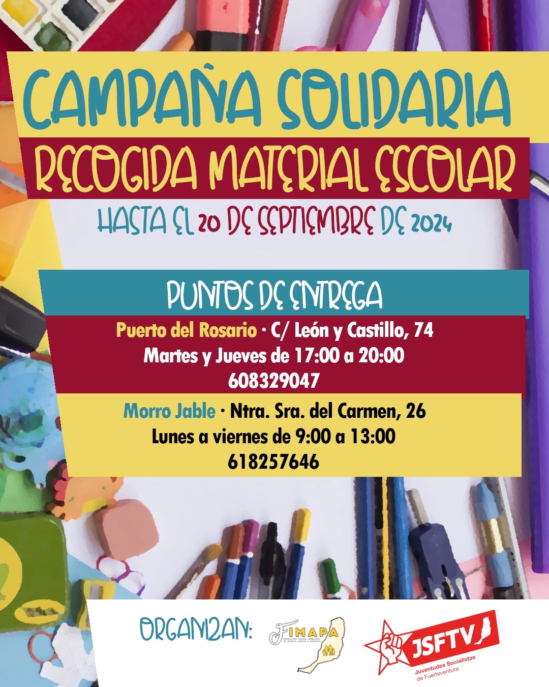 Las Juventudes Socialistas de Fuerteventura y la Federación Insular Majorera de Madres, Padres y Alumnos (FIMAPA) han lanzado una campaña solidaria para recolectar material escolar destinado a las familias con menos recursos. Esta iniciativa busca apoyar a las familias en el inicio del año escolar, un periodo que representa un gran gasto económico, estimado en unos 400€ por niño.