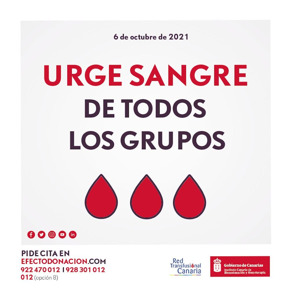 El Instituto Canario de Hemodonación y Hemoterapia (ICHH), dependiente de la Consejería de Sanidad del Gobierno de Canarias, tiene instalado un punto temporal de donación en la unidad de apoyo a la docencia, en la antigua Universidad Popular, cuyo horario de donación hoy miércoles será de 8:45 a 14:00, el jueves de 15:45 a 21:00 y el viernes de 8:45 a 11:00 horas. Esta campaña tiene previsto permanecer operativa hasta el 29 de octubre.
