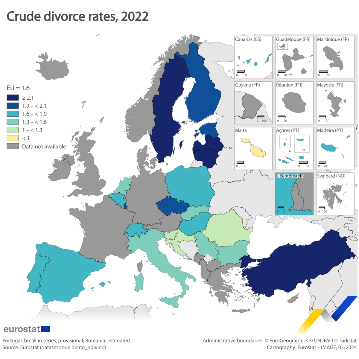 Según datos de Eurostat de 2022, la tasa mayor de divorcios en la Unión Europea se dio en Letonia con 2.9 divorcios por cada 1.000 habitantes, seguida de Lituania (2,6) y Suecia (2,1).