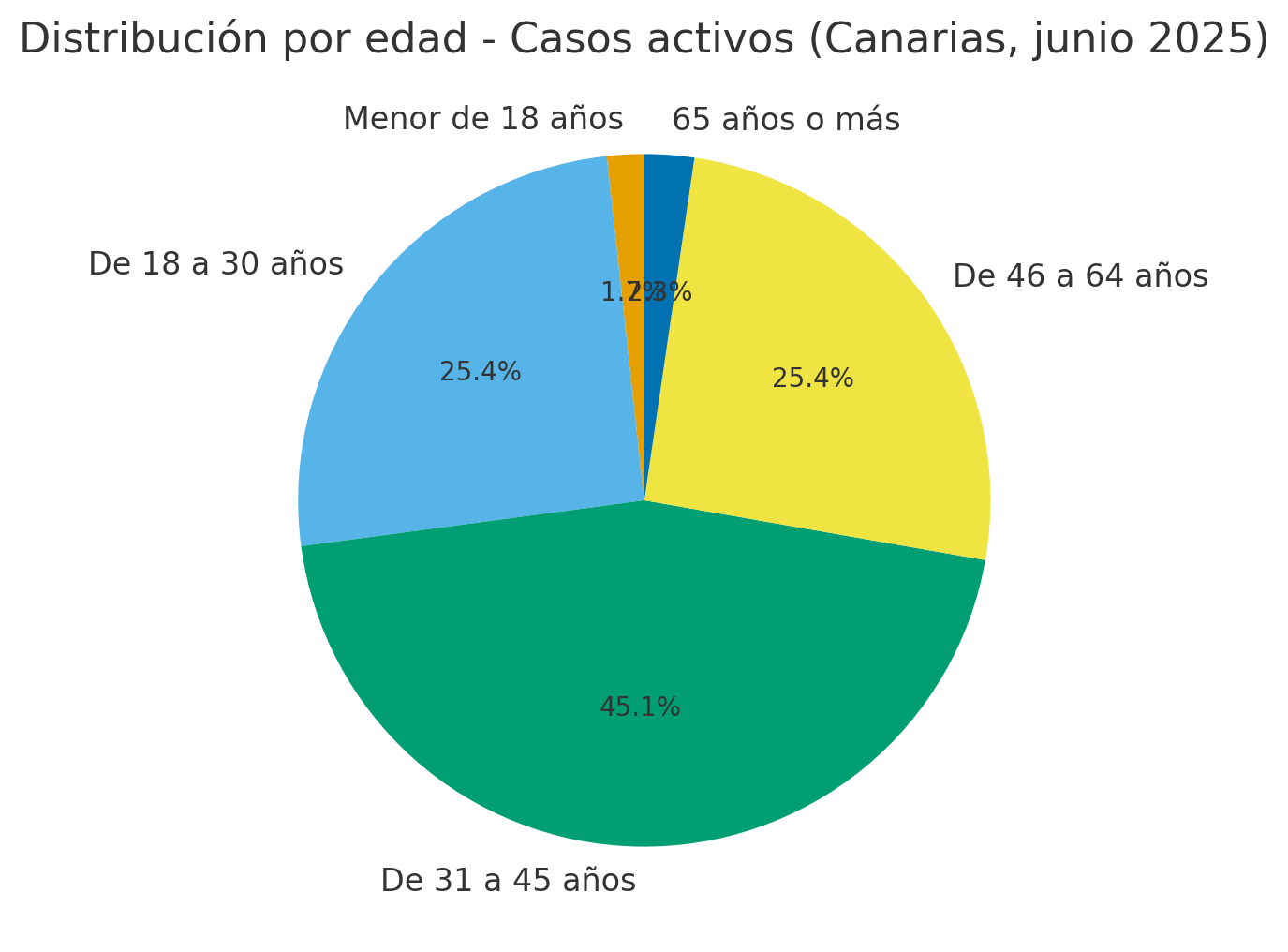 Con apoyo en la última desagregación mensual disponible del ISTAC (junio de 2025) —muy alineada con la foto de agosto—, el reparto de casos activos por edad en Canarias fue: 31–45 años: 45,1%, 18–30 años: 25,4%, 46–64 años: 25,4%, Menores de 18: 1,7%, 65 o más: 2,3%.