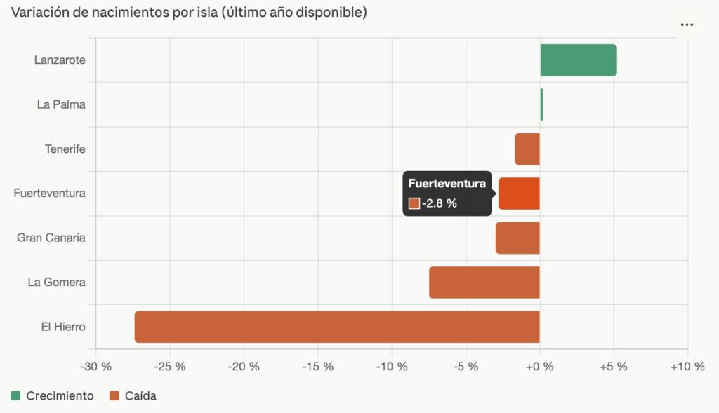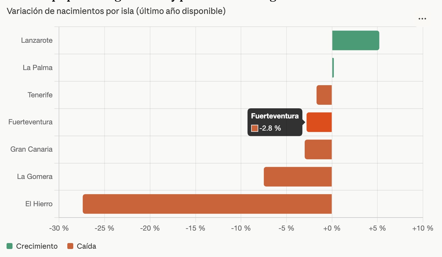 - La Palma apenas crece un 0,2 %, La Gomera cae un 7,5 % y El Hierro registra un desplome del 27,4 %, pasando de 73 nacimientos en 2022 a tan solo 53 en 2023.