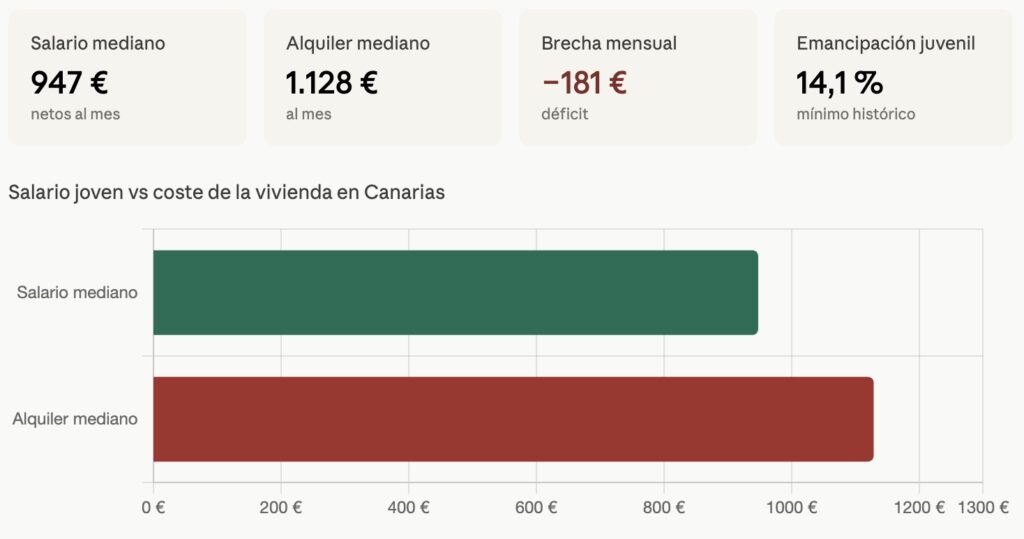 Entre 2014 y 2024, el alquiler en Canarias se ha encarecido un 68,1 %, casi el doble del incremento estatal. La estacionalidad turística —contratos cortos, jornadas parciales, temporalidad— y la sobrecualificación (el 36 % de los jóvenes está sobrecualificado para su empleo) completan el cuadro de una generación a la que el sistema no le ofrece estabilidad para tener hijos.