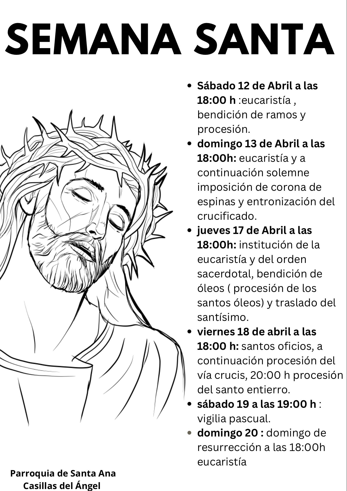 La vigilia pascual se celebrará el sábado 19 a las 19:00 horas, y culminarán las celebraciones el domingo 20 de abril, con la eucaristía de Resurrección a las 18:00 horas.