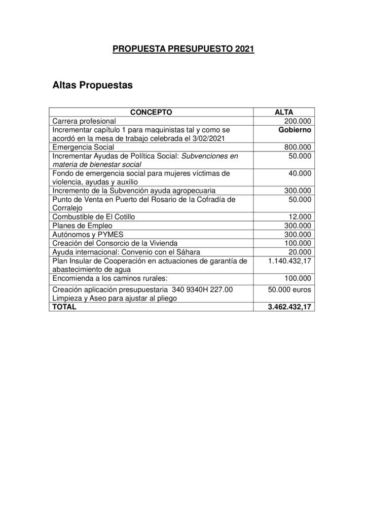 Los grupos piden declarar la Emergencia Social y dotar con 800.000 euros el refuerzo a los servicios sociales municipales tanto con personal como con recursos económicos así como incrementar en 300.000 euros las ayudas a autónomos y pymes y 300.000 euros para crear un nuevo plan de empleo que permita crear puestos de trabajo en la peor crisis económica que recuerda la isla de Fuerteventura.