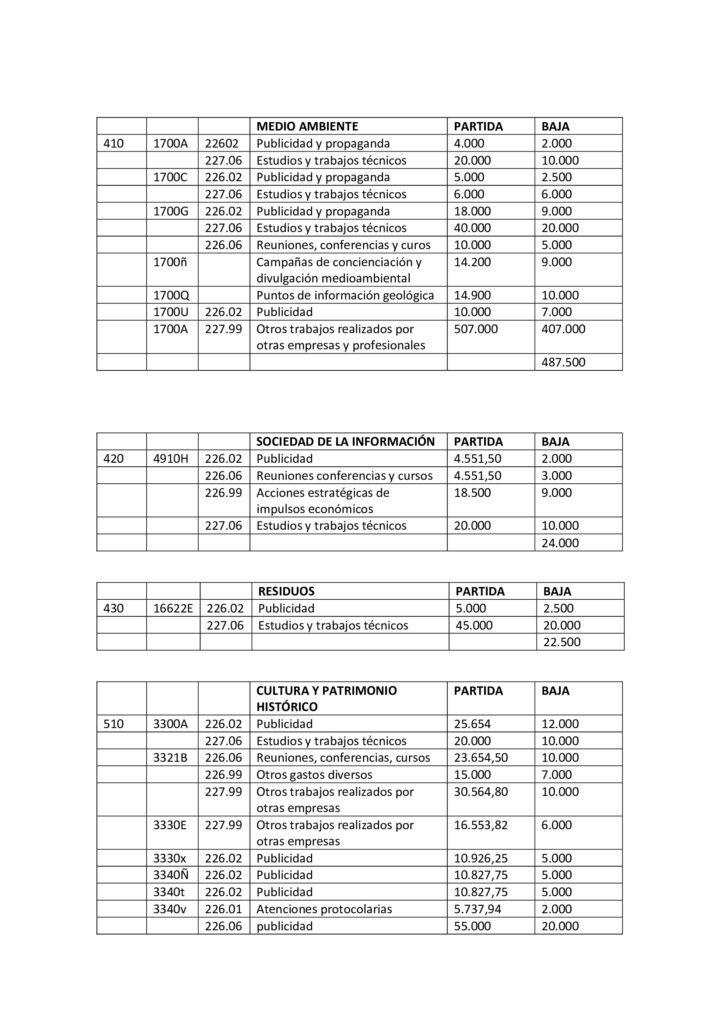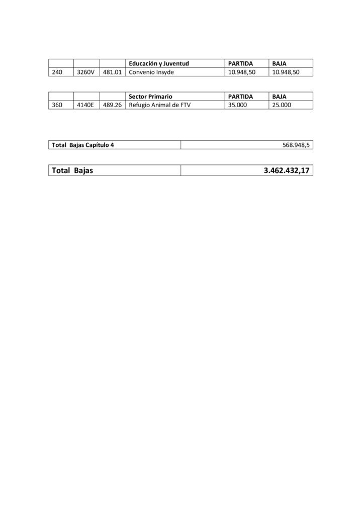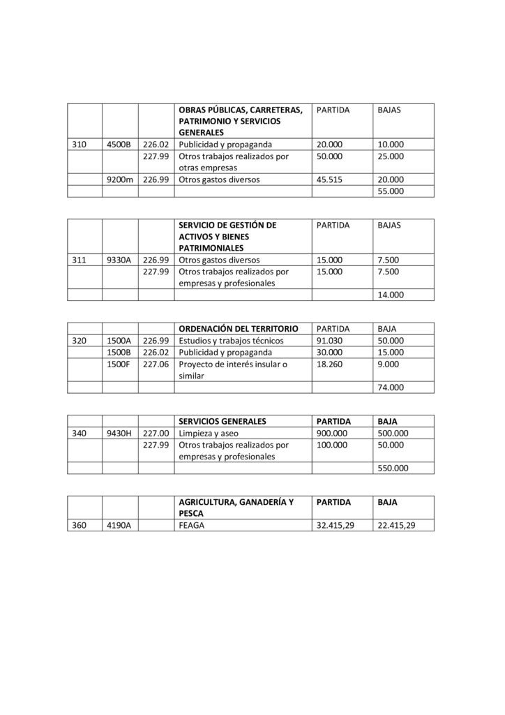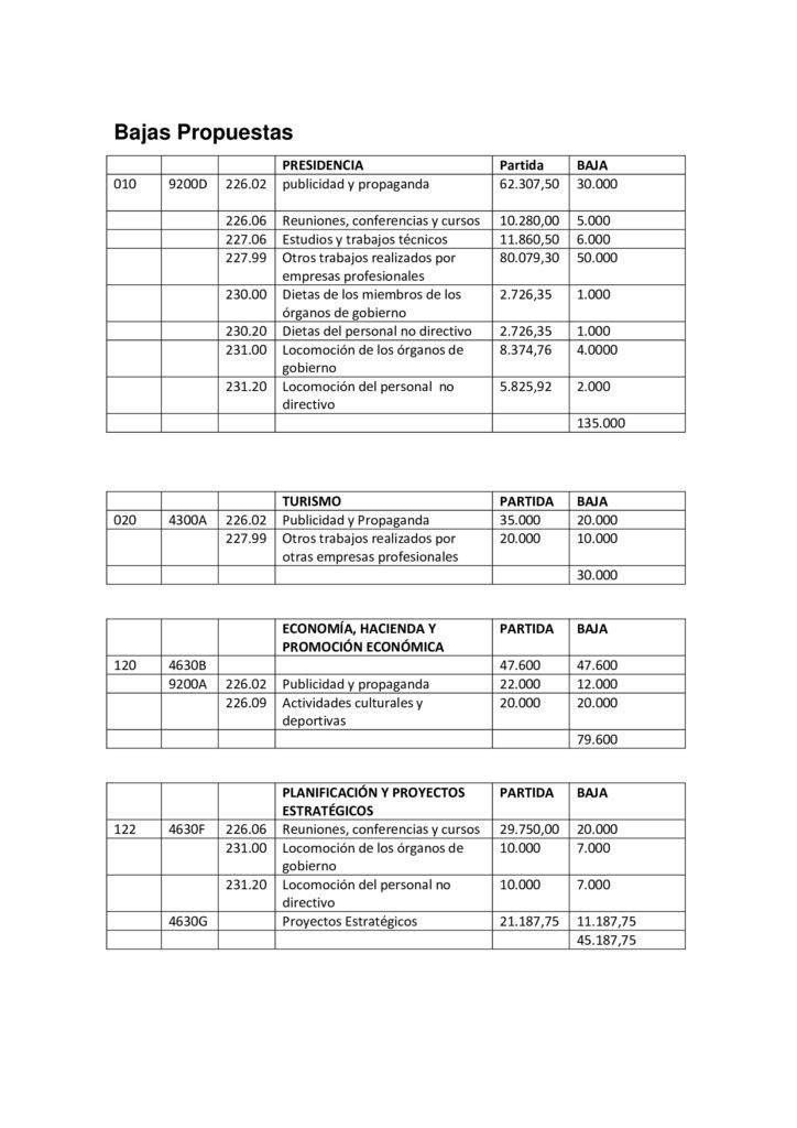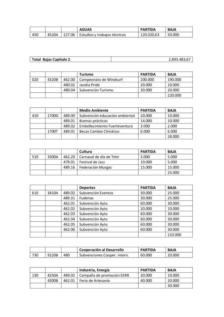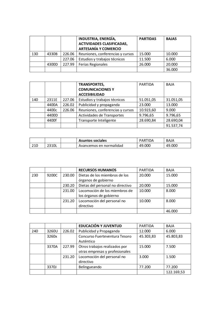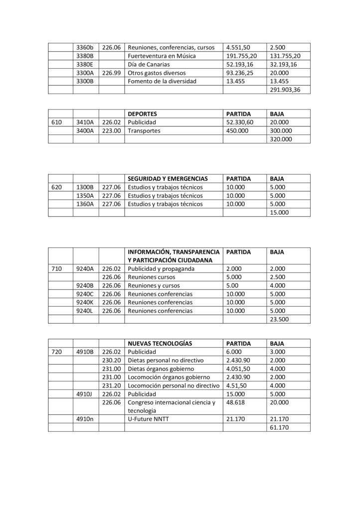 Para dar cobertura a todas estas altas, AMF, CC y PP proponen bajar partidas presupuestarias asociadas a dietas, locomoción de cargos directivos y no directivos, publicidad y propaganda así como asumir que grandes festivales o eventos deportivos como el Fuerteventura en Música o el campeonato Mundial de Windsurf no se celebrarán en el formato tradicional donde se aglutinen miles de personas por lo que no es necesario contar en el presupuesto con fichas presupuestarias de 200.000 euros.
