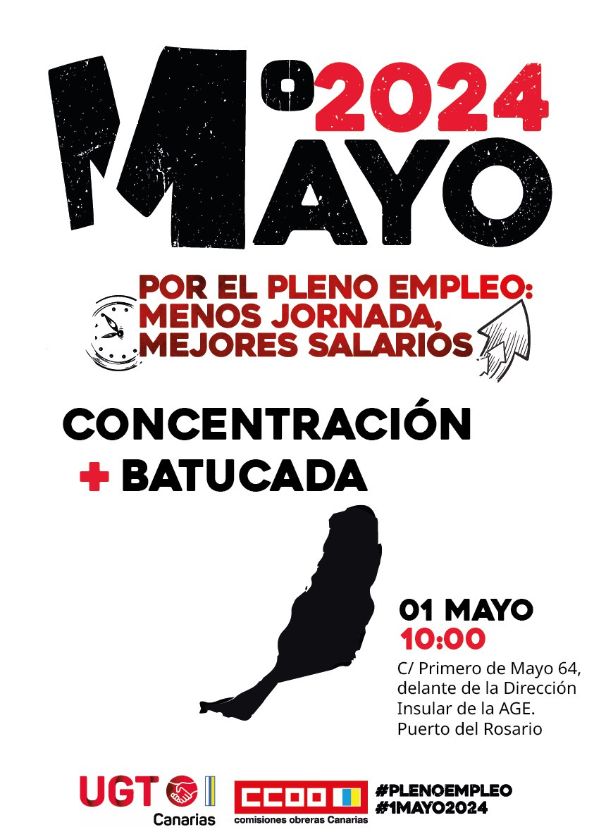 Comisiones Obreras y UGT convocan una concentración en Fuerteventura por el día Internacional de las personas trabajadoras el próximo 1 de Mayo, frente a la Dirección Insular de la AGE, en la Avenida Primero de Mayo de la capital, a las 10.00.