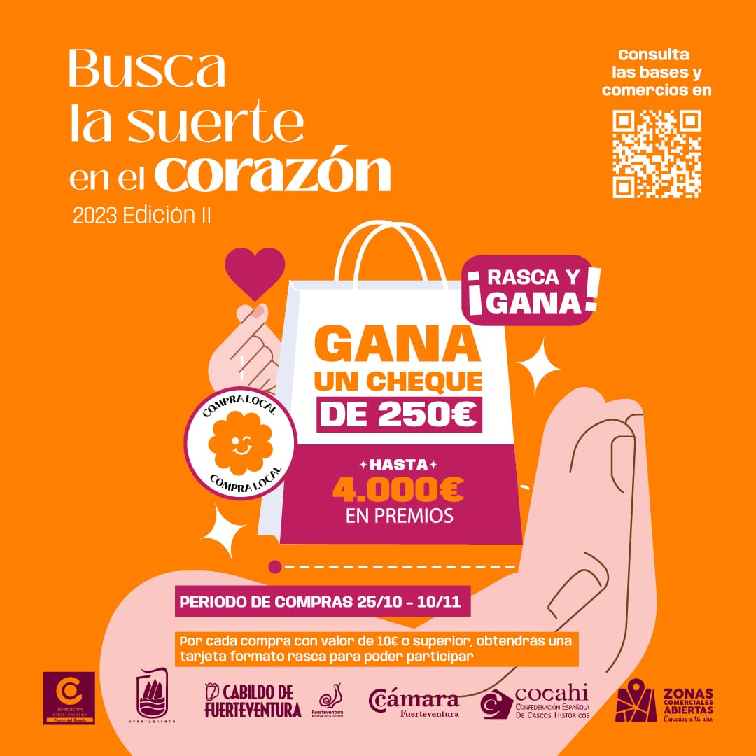 El Ayuntamiento de Puerto del Rosario, a través de la Concejalía de Comercio, con el impulso de la Asociación de Empresarios de Puerto del Rosario y en colaboración con el Cabildo de Fuerteventura, Gobierno de Canarias, Cámara de Comercio de Fuerteventura y la Confederación Española de Cascos Históricos presentan la segunda edición de la campaña comercial ‘Busca la suerte en el corazón’, en formato ‘rasca y gana’, que repartirá hasta 4.000 euros en 16 premios de 250 euros cada uno.