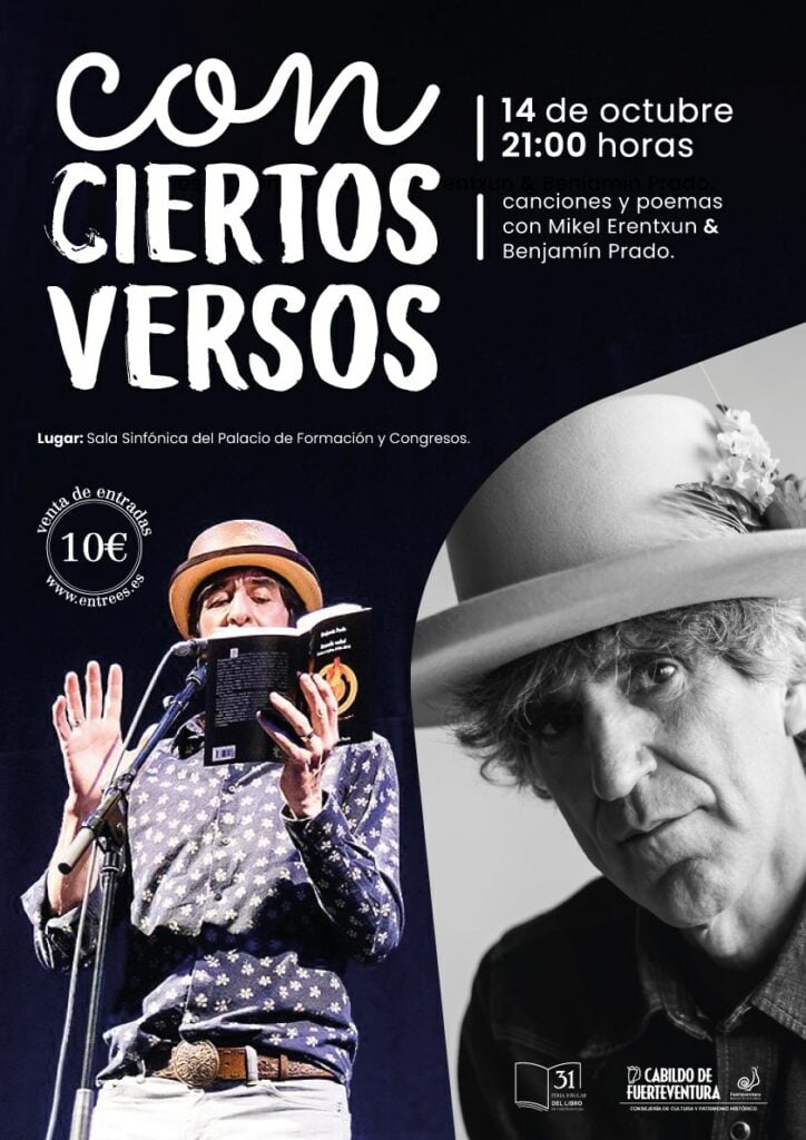 La 31 edición de la Feria Insular del Libro de Fuerteventura, que se desarrollará del jueves 14 al domingo 17 de octubre en la plaza del Palacio de Formación y Congresos, presenta el espectáculo poético musical Con Ciertos Versos, de la mano del conocido cantante Mikel Erentxun y el poeta Benjamín Prado. El acto tendrá lugar durante la primera jornada del encuentro literario majorero, el jueves día 14, a partir de las 21:00 horas en la Sala Sinfónica del recinto cultural insular. Las entradas para asistir están ya a la venta, a través de la plataforma entrees.es, al precio de diez euros.