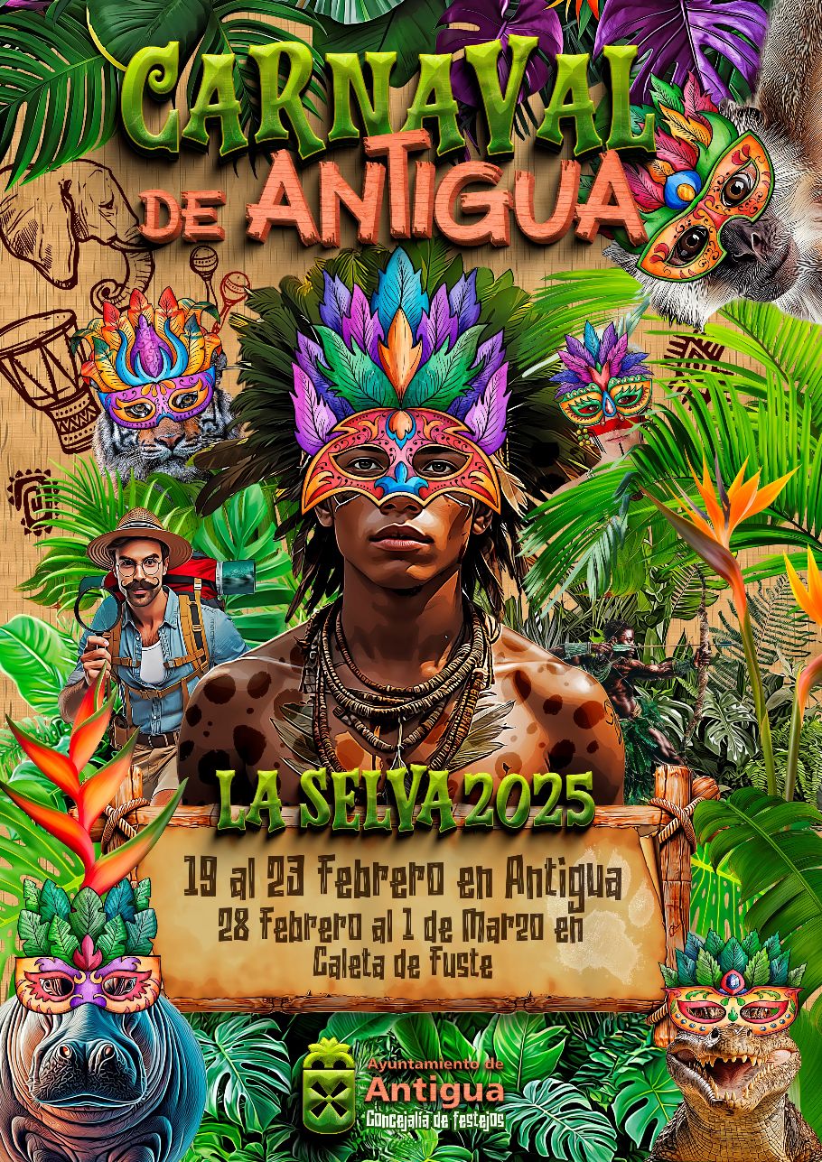 El municipio de Antigua se prepara para celebrar el Carnaval 2025, inspirado este año en la temática “La Selva”. Las festividades, que se desarrollarán del 19 al 23 de febrero en Antigua y del 28 de febrero y 01 de marzo en Caleta de Fuste, ofrecerán una variada programación que incluye pasacalles, concursos, actuaciones, desfiles y grandes verbenas.