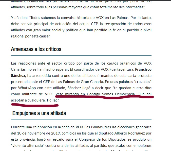Tras leer la noticia de los militantes y excargos de VOX en Canarias, publicada por el periódico EL CIERRE DIGITAL, donde el coordinador de VOX Fuerteventura, Francisco Sánchez en unas palabras cruzadas vía WhatsApp con uno de sus afiliados llego a decir que “te quedan cuatro días como militante de VOX. Vete mirando en Contigo Somos Democracia, que ahí aceptan a cualquiera”.