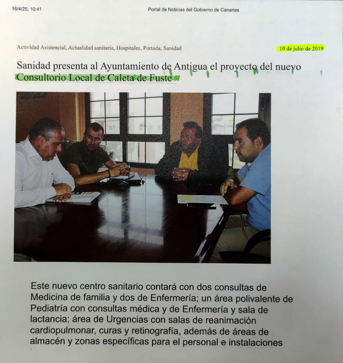 Consultando la documentación en su mano, fue desgranando los procedimientos encaminados, por un lado, a la creación de una infraestructura sanitaria en Caleta de Fuste; y por otro, a lograr servicio de urgencias 24 horas en Antigua.