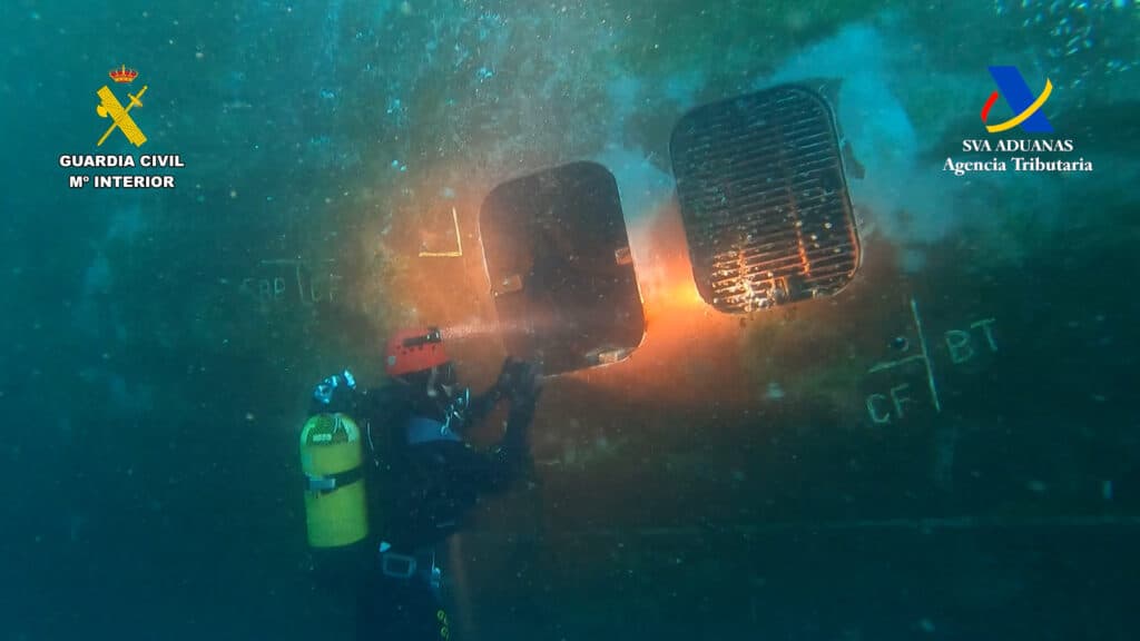 A continuación, buzos del Grupo Especial de Actividades Subacuáticas (GEAS) de la Guardia Civil inspeccionaron uno de los buques mercantes atendidos por esta embarcación de suministro. En las rejillas de aspiración de agua de mar del casco se localizó una bolsa negra que contenía otros 22 kilos de cocaína.