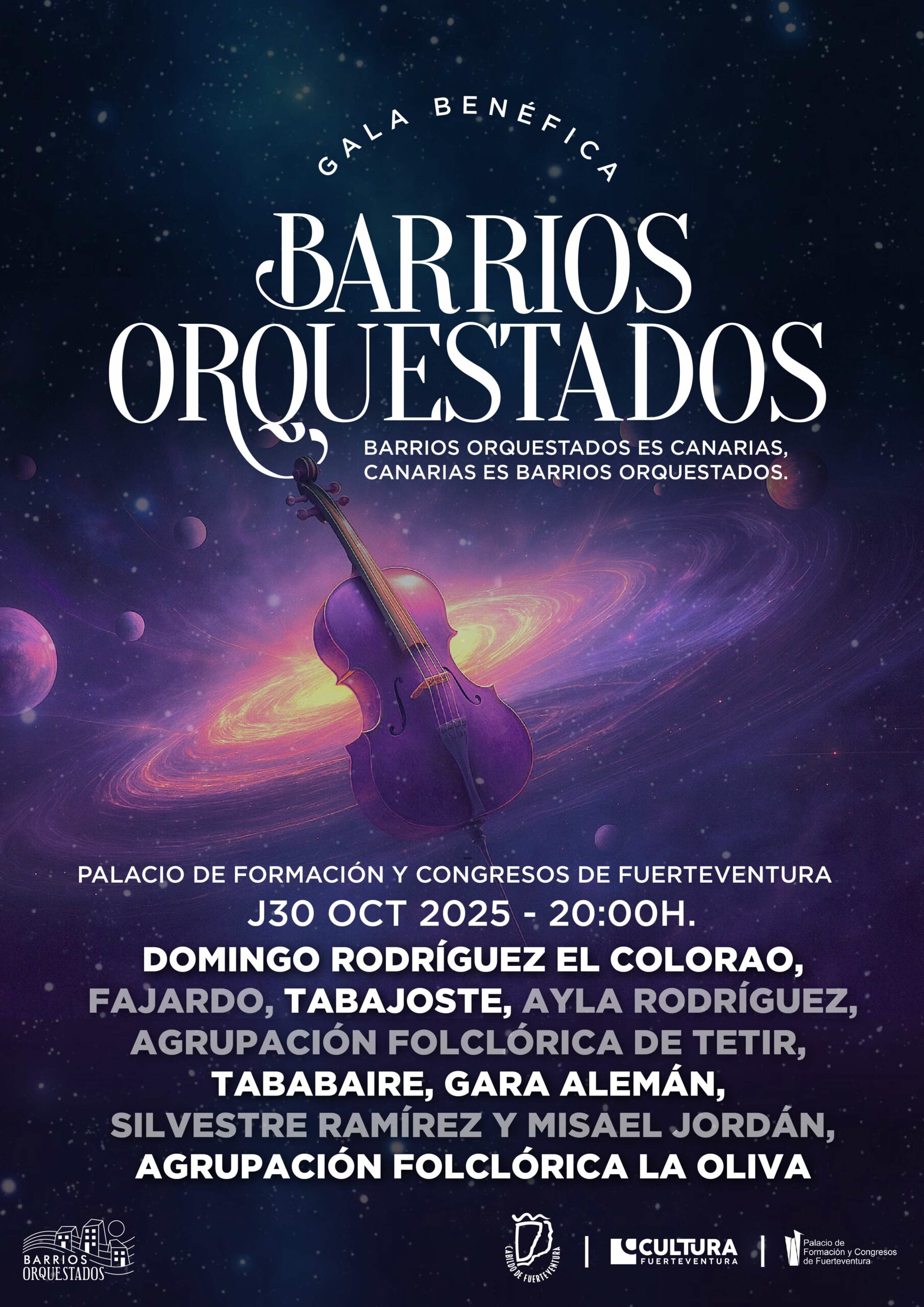 El próximo jueves, 30 de octubre, el Palacio de Formación y Congresos de Fuerteventura acogerá la Gala Benéfica de Barrios Orquestados, un encuentro que reunirá a algunos de los artistas más reconocidos del panorama musical insular con un mismo objetivo: apoyar la continuidad del proyecto músico-social que promueve la inclusión a través de la formación musical gratuita.