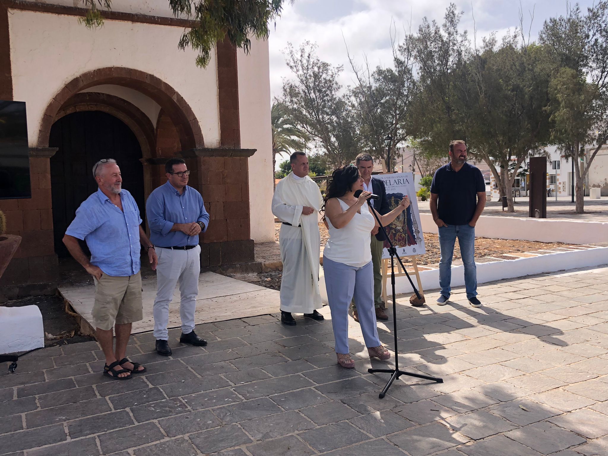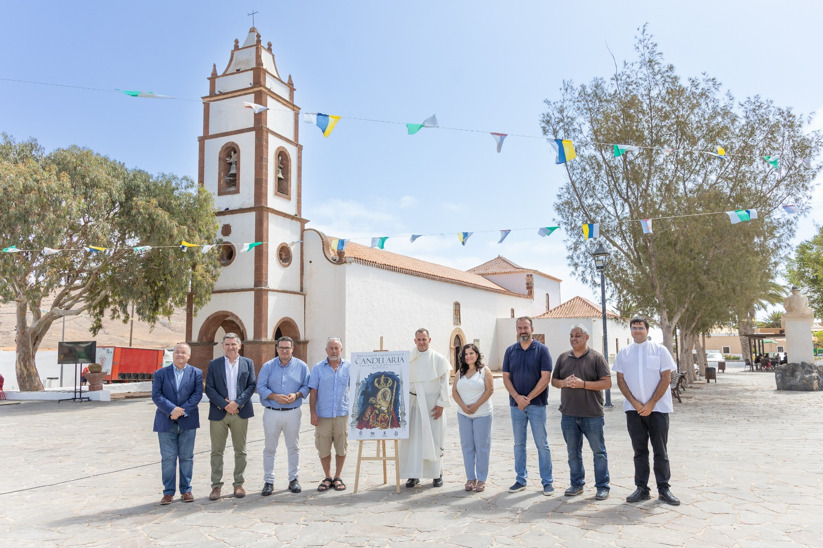 En la rueda de prensa celebrada en la Plaza de Tetir estuvieron presentes, la alcaldesa, Mari Brito, el alcalde de Puerto del Rosario, David de Vera, el Prior de los Padres Dominicos y Rector de la Basílica, Juan Manuel Martínez, el concejal de Cultura y Fiestas, Manuel González, Domingo Colorado, pregonero, y Silvestre Chacón, autor del cartel.