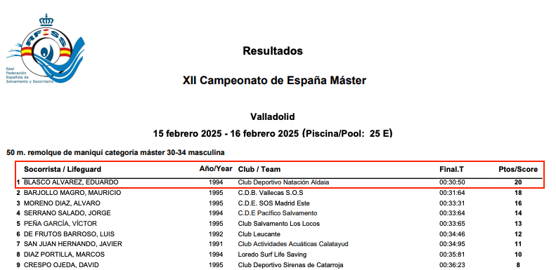 El nadador internacional Edu Blasco, nacido en el País Vasco y criado en Fuerteventura, continúa su dominio en el salvamento y socorrismo tras alzarse con la victoria en el XII Campeonato de España Máster, celebrado en Valladolid los días 15 y 16 de febrero de 2025. Blasco, compitiendo en la categoría máster, se impuso en la prueba de 50 metros remolque de maniquí, logrando un tiempo de 00:30.50, lo que le permitió subir a lo más alto del podio.