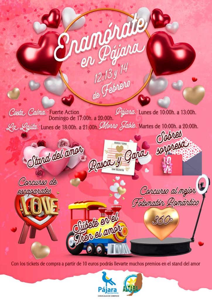 El Ayuntamiento de Pájara, a través de la Concejalía de Comercio que coordina, Alejandro Cacharrón, y en colaboración con la Asociación de Pequeñas y Medianas Empresas del Municipio de Pájara ‘Altaba’, celebra San Valentín por todo lo alto con la campaña ‘Enamórate en Pájara’. Esta iniciativa está destinada a impulsar el comercio en los pueblos sureños.