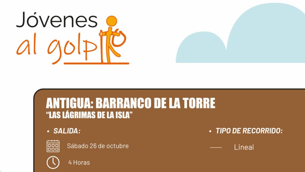 La cuarta ruta del programa Jóvenes al Golpito, con el título Las Lágrimas de la Isla, llevará a los participantes a explorar la zona del Barranco de la Torre, en el municipio de Antigua, el próximo sábado 26 de octubre. La Consejería de Juventud del Cabildo de Fuerteventura, dirigida por Adargoma Hernández, ya ha abierto el plazo de inscripción para esta excursión, que contará, además, con servicio de guagua para facilitar la participación de los inscritos.