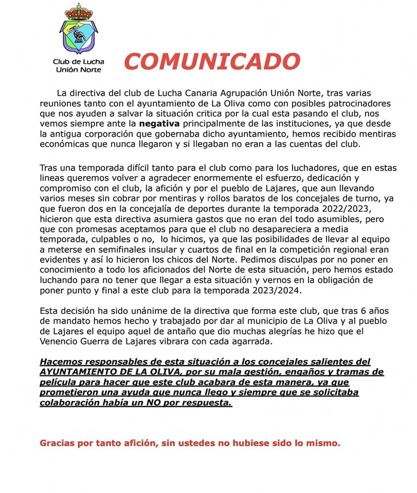 El C.L. Unión Norte de La Oliva no competirá la próxima temporada.