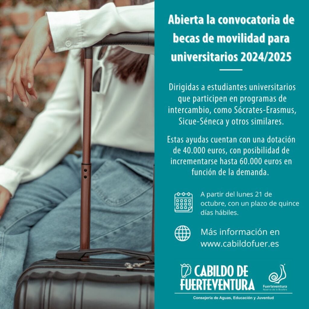 El Cabildo de Fuerteventura, a través de la Consejería de Educación que dirige Adargoma Hernández, abre este lunes, 21 de octubre, la convocatoria de becas de movilidad para el curso académico 2024/2025, dirigidas a estudiantes universitarios que participen en programas de intercambio, como Sócrates-Erasmus, Sicue-Séneca y otros similares.