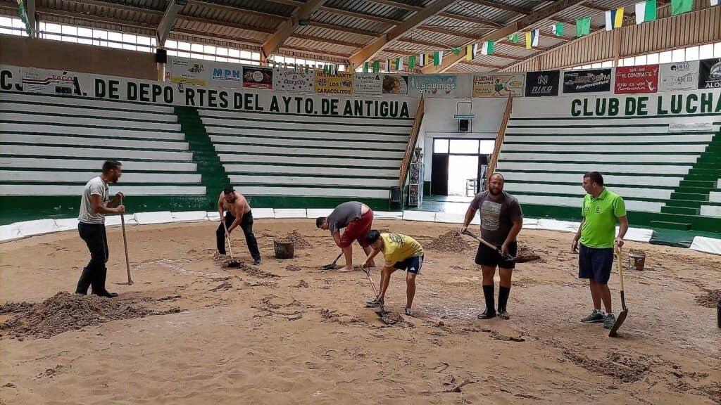 El esfuerzo en equipo logra reparar el terrero de lucha de Antigua tras quedar inundado