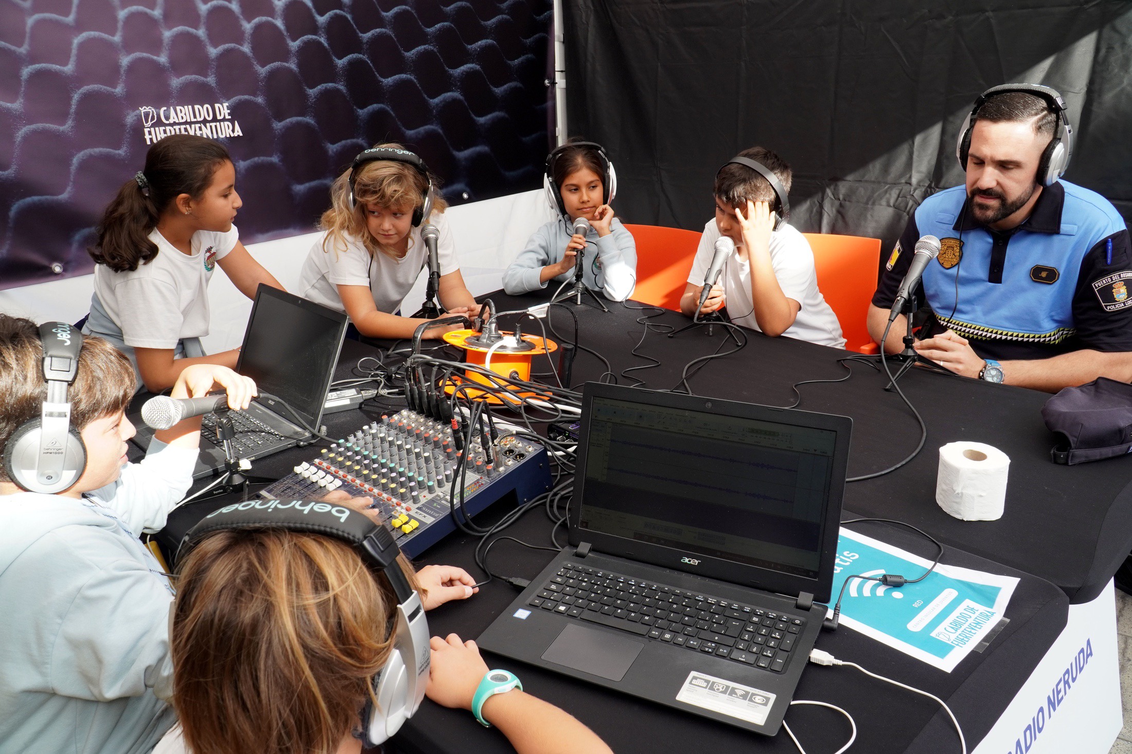 Radio Insular Fuerteventura participó en esta cita con todo su equipo humano y técnico, instalando un set propio para la emisión simultánea en radio y redes sociales. La colaboración se realizó de manera completamente desinteresada, con el objetivo de acompañar, apoyar y amplificar la labor de las radios escolares, reforzando así el compromiso de la emisora con la educación y con los más jóvenes de la Isla.