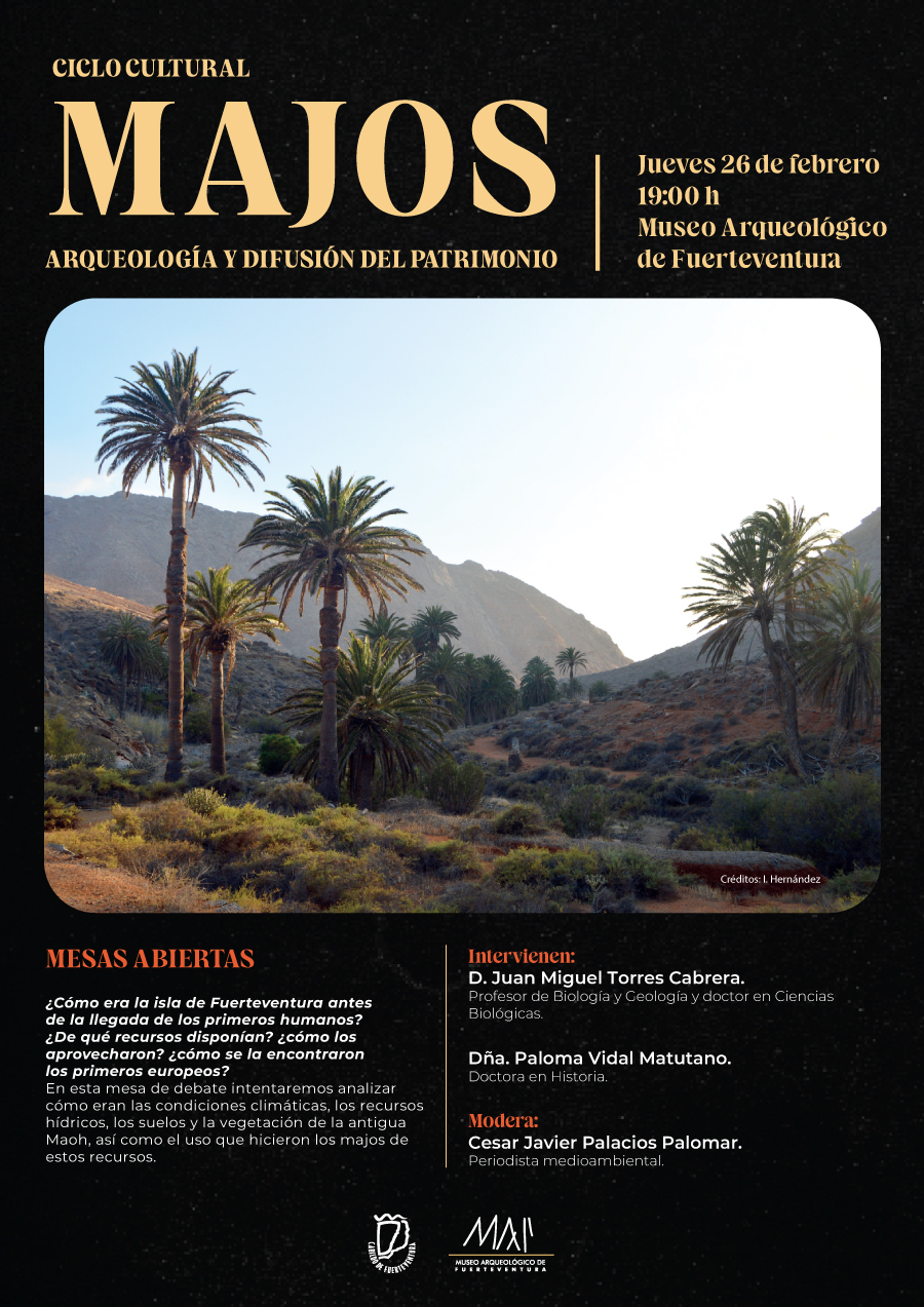 El Museo Arqueológico de Fuerteventura (MAF) celebrará el próximo jueves 26 de febrero, a las 19.00 horas, la segunda sesión del Ciclo Cultural Majos, un programa de debates y coloquios centrado en el patrimonio arqueológico y cultural de la isla. En esta ocasión, el encuentro se dedicará al medio natural de la antigua Erbania y a los recursos disponibles para la supervivencia de los majos antes de la llegada de los europeos.