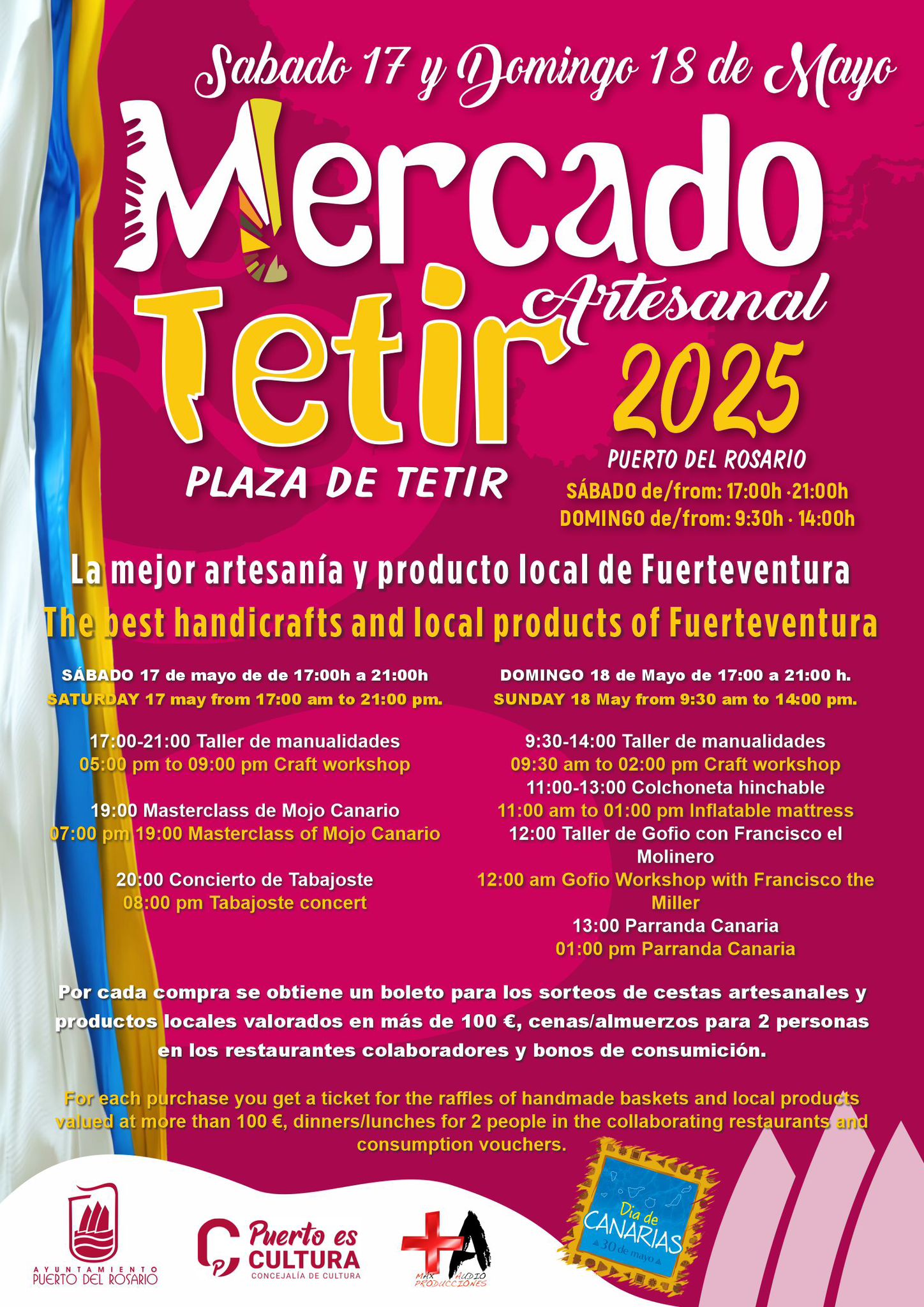 El evento, organizado por la Concejalía de Cultura del Ayuntamiento de Puerto del Rosario en colaboración con Maxaudio Eventos, dará comienzo el sábado 17 de mayo, de 17:00 a 21:00 horas, con un taller de manualidades para todos los públicos, una Masterclass de Mojo Canario a las 19:00 horas, y el esperado concierto del grupo Tabajoste a las 20:00 horas.