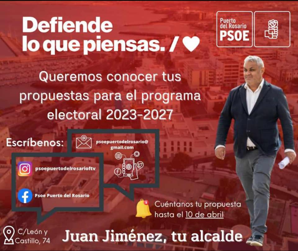 El Partido Socialista de Puerto del Rosario ha comenzado a elaborar el programa electoral que presentaremos a las elecciones locales del próximo mes de mayo de 2023. Es por ello, que abren un proceso de participación ciudadana activo, en el que solicitan la colaboración de todos los vecinos y vecinas interesados en aportar sus ideas.