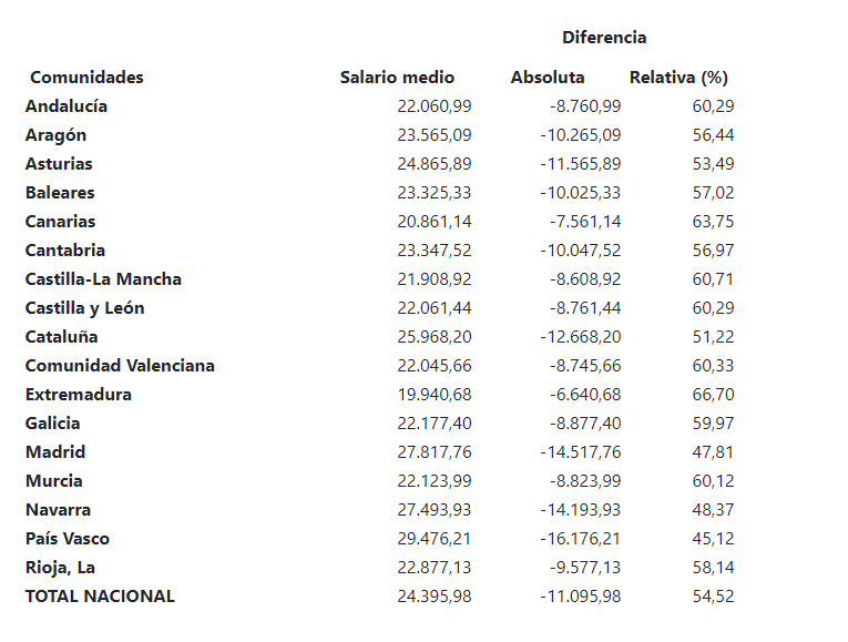 En el siguiente cuadro figura la cuantía del salario medio en cada comunidad autónoma; la diferencia, en euros, entre percibir el SMI y ese sueldo medio, y el porcentaje que el SMI supone respecto al mencionado salario medio regional: