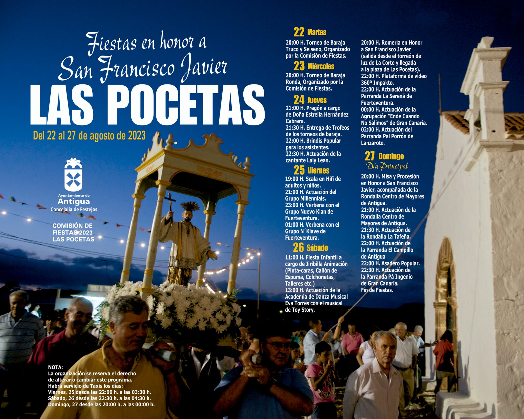 Las Pocetas celebra sus Fiestas en honor a San Francisco Javier del 22 al 27 de agosto, ofreciendo la Comisión de Fiestas y el Ayuntamiento de Antigua un cartel en el que no faltan, detalla el concejal Agustín Rodríguez, el torneo de baraja, actuaciones musicales, fiestas infantiles, verbena de madrugada, divertida Scala en Hiffi de adultos, niños y niñas, encuentro de rondallas y parrandas y por supuesto, Romería desde el Torreón de La Corte y el Día Principal el domingo 27, Oficio, Procesión y Asadero popular en honor a San Francisco Javier.
