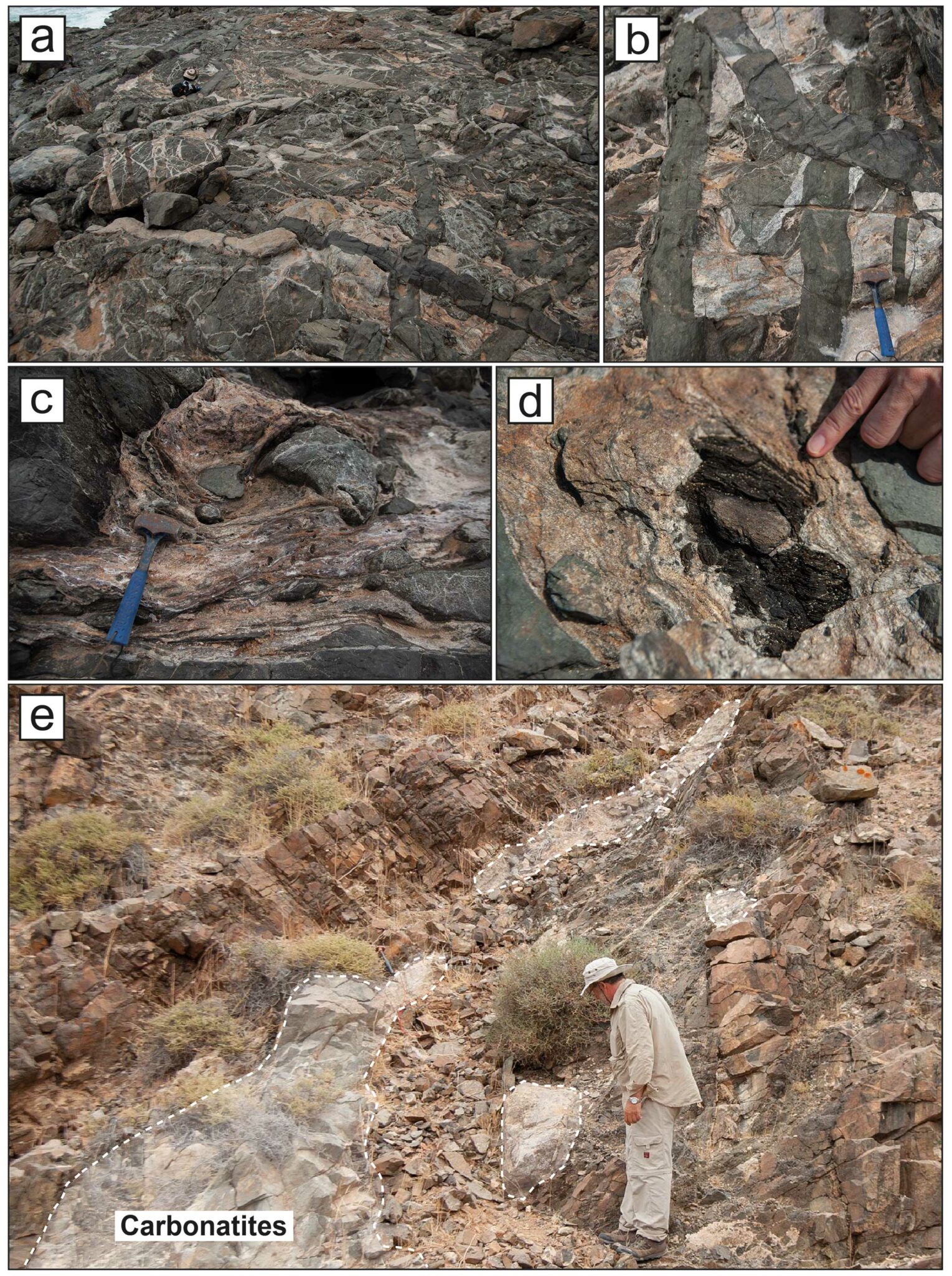 Se han observado diques carbonatíticos de escala métrica, que presentan las concentraciones más altas de tierras raras en el área estudiada.- Sector 2: (Pájara)