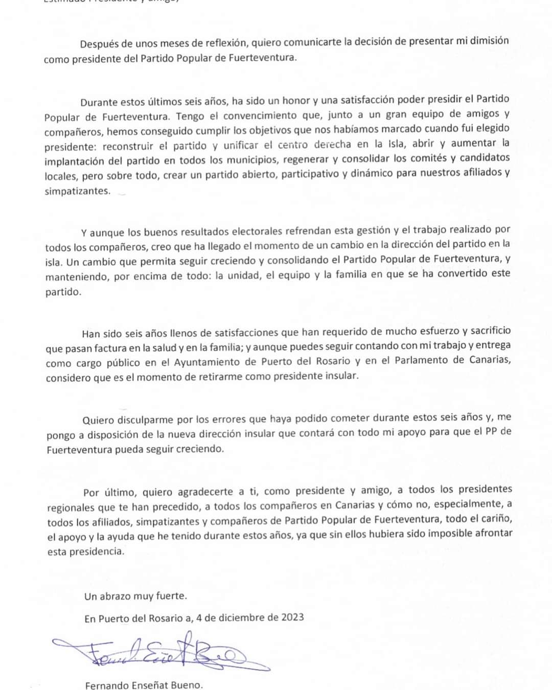 Fernando Enseñat presenta su dimisión como presidente del PP en Fuerteventura