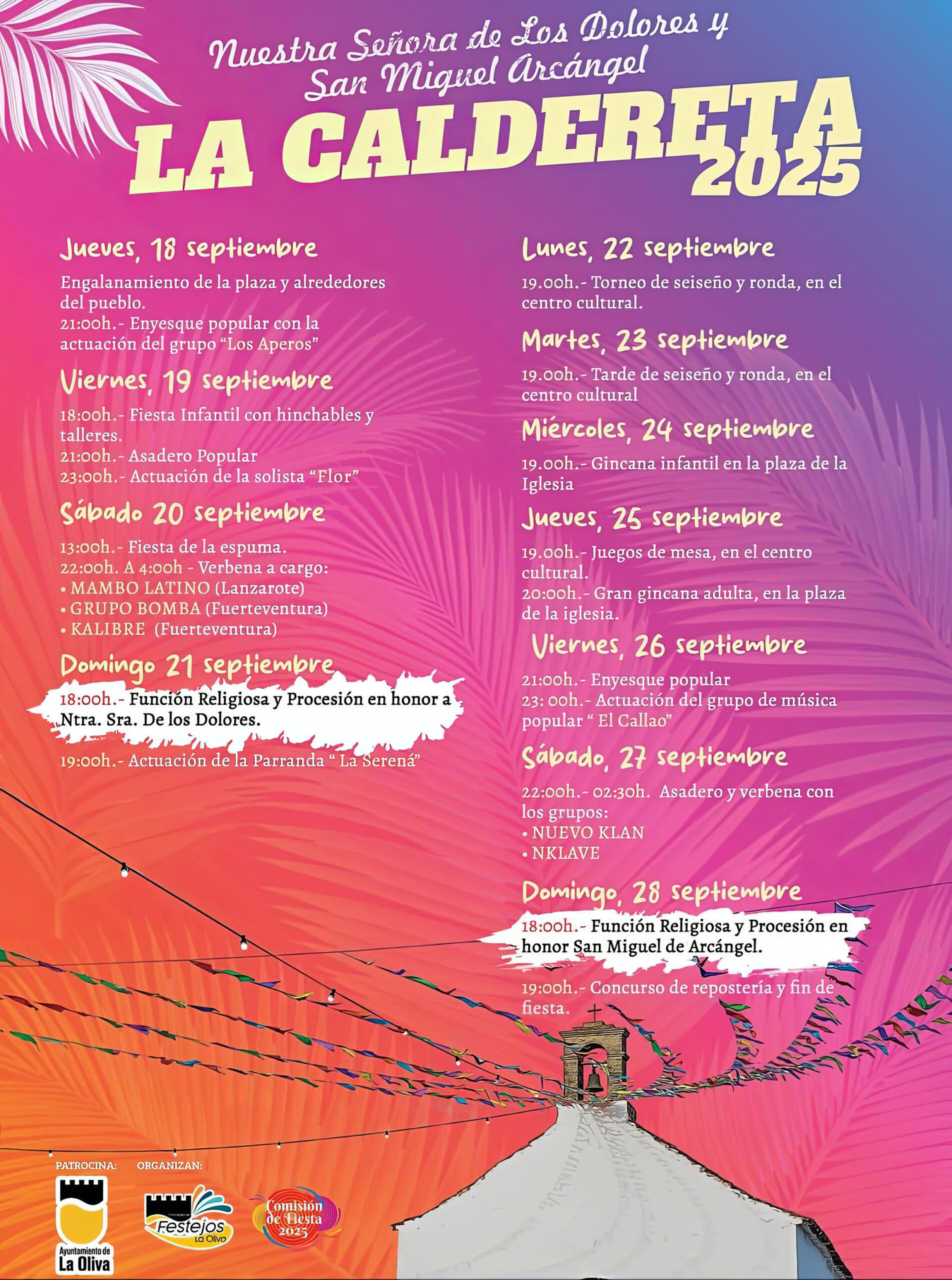 La Caldereta se prepara para vivir del 18 al 28 de septiembre las fiestas en honor a Nuestra Señora de Los Dolores y San Miguel Arcángel, un calendario que mezcla tradición religiosa, convivencia vecinal y diversión popular. Estas celebraciones se suman a un septiembre cargado de actos patronales en Fuerteventura. En el caso de La Caldereta, el programa de 2025 se presenta variado y dirigido a todos los públicos: