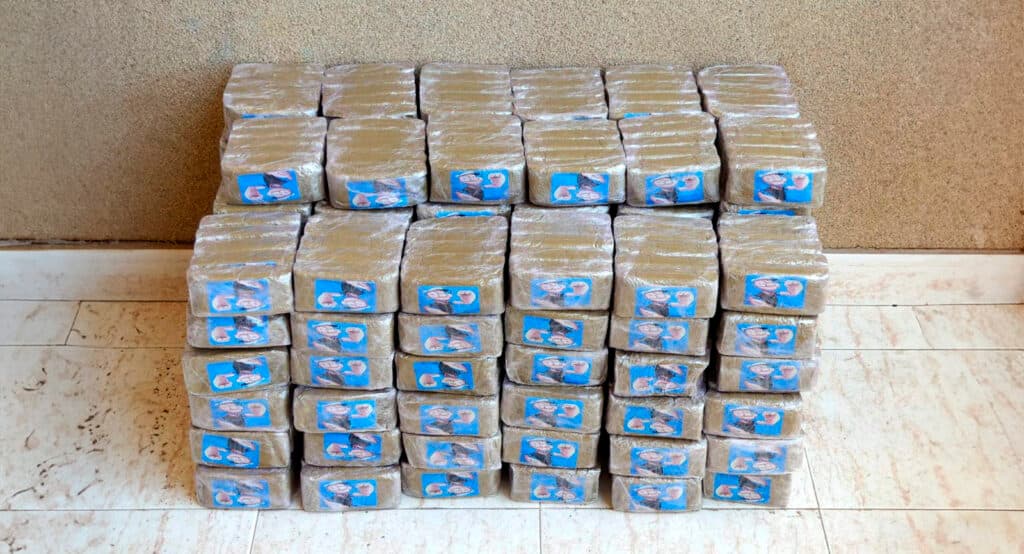 La operación culminó cuando se desplegó un dispositivo policial en el muelle, donde los agentes lograron detener al hombre, quien ofreció gran resistencia durante el arresto. Tras su detención, se procedió al registro del vehículo, encontrando tres paquetes sospechosos en su interior. Al inspeccionar los paquetes, los agentes comprobaron que contenían un total de 599 piezas rectangulares de una sustancia vegetal resinosa, de color marrón, identificada como polen de hachís, con un peso aproximado de 59.900 kilogramos. Los paquetes llevaban un dibujo de “Popeye”, lo que podría ser un signo distintivo relacionado con la organización criminal implicada.