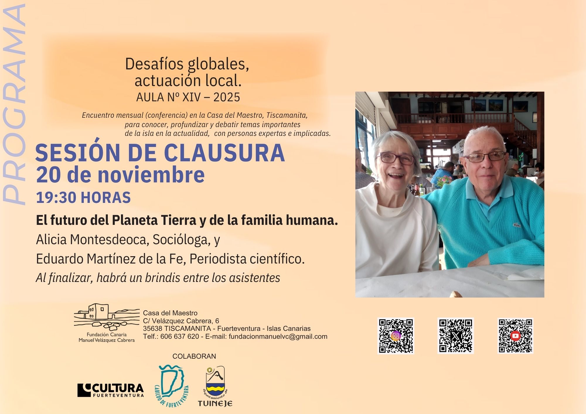 La conferencia de cierre estará dirigida por la socióloga Alicia Montesdeoca Rivero y el periodista científico Eduardo Martínez de la Fe, bajo el título “El futuro del planeta Tierra y de la familia humana”. La sesión ofrecerá una visión panorámica sobre el momento crítico que vive la humanidad y sintetizará los principales diagnósticos trabajados a lo largo del ciclo, articulando un horizonte “esperanzador y riguroso” para la acción colectiva.