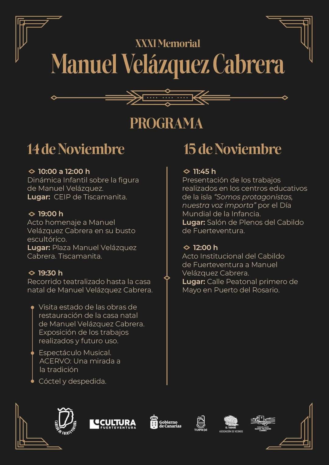 El Cabildo de Fuerteventura, a través de la Consejería de Cultura que dirige Rayco León, organiza el XXXI Memorial Manuel Velázquez Cabrera en honor al político majorero y considerado el padre de los cabildos modernos. El homenaje se celebrará mañana y el viernes con una programación de actos conmemorativos en Tiscamanita y Casa Palacio.