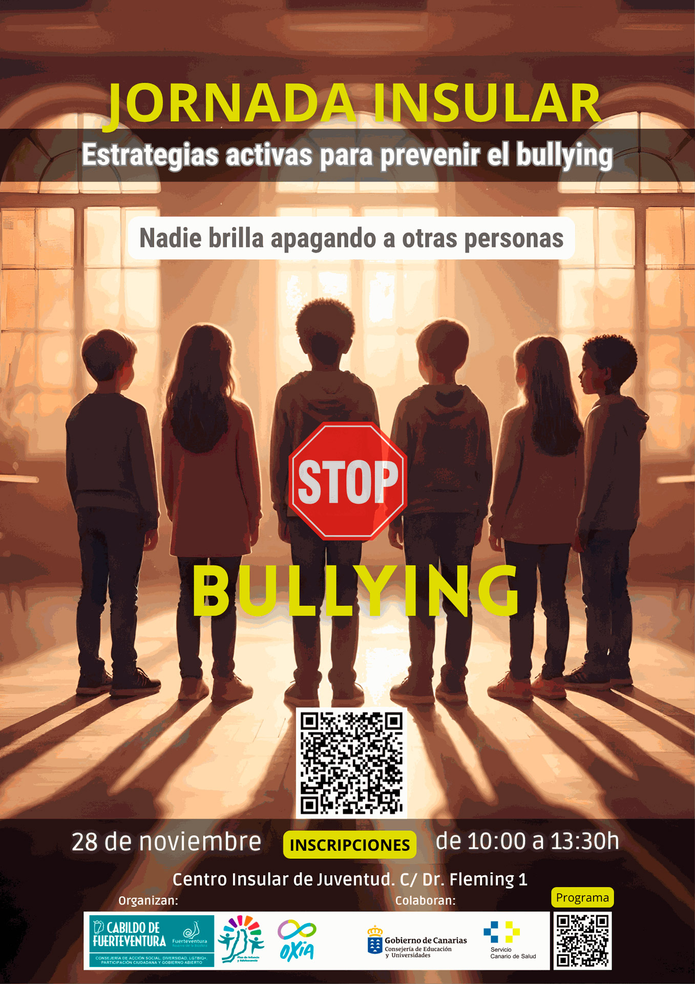 El Cabildo de Fuerteventura ha organizado una jornada formativa y comunitaria destinada a reforzar la prevención del acoso escolar en la Isla, en el marco del Día Internacional de los Derechos de la Infancia. Bajo el título Estrategias activas para prevenir el bullying en Fuerteventura, la sesión tendrá lugar el próximo 28 de noviembre de 2025, de 10:00 a 13:30 horas, en el salón de actos del Centro Insular de Juventud, en Puerto del Rosario.