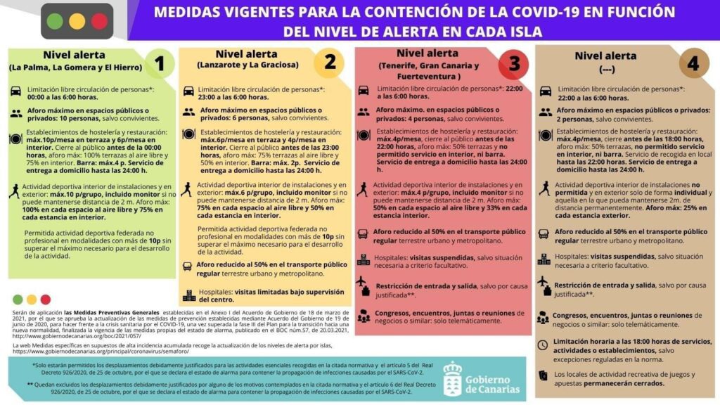 «El archipiélago adopta nuevas medidas y límites de movilidad, también entre islas del Real Decreto 926, exigiendo una prueba negativa para poder trasladarse entre islas. Se potenciará los controles en aeropuertos y puestos de las islas. Se limitarán las reuniones entre no convivientes, en los espacios públicos, cerrados y aire libre, se limitará salvo a los convivientes. Los niveles de alerta 1 y 2 quedarán regulados como el nivel 3, no se sobrepasará las 4 personas. Además se añade que la permanencia de personas en lugares privados, también se limitará según los niveles. En cuanto al toque de queda, en el nivel 1 será a las 23.00 horas, mientras que el nivel de alerta 2 se equiparará al nivel 3, de las 22.00 a las 6.00 horas«.