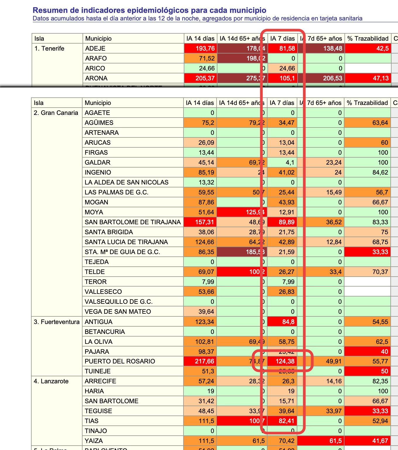 En esa isla, la tasa de IA a 7 días está en riesgo alto los cuatro últimos días y es la más elevada del Archipiélago, con un valor promedio en la última semana de 78 casos por 100.000 habitantes y con un incremento del 22% respecto a la semana anterior, 14 puntos más en el valor de la tasa. En el día de ayer se situaba en 82,7 casos por 100.000 habitantes.